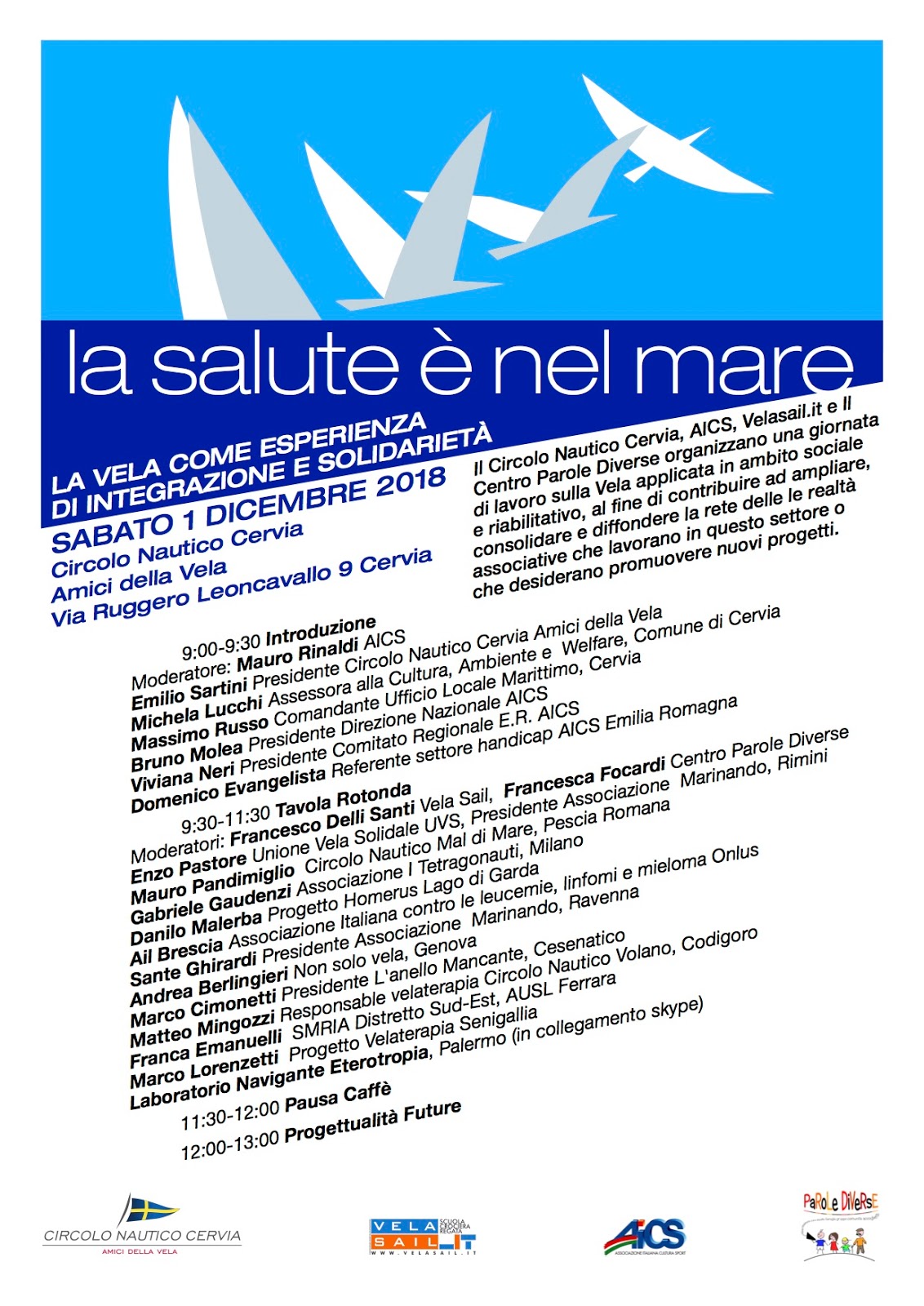 L’importante giornata di lavoro sulla Vela applicata in ambito sociale e riabilitativo, al fine di contribuire ad ampliare, consolidare e diffondere la rete delle realtà associative che lavorano in questo settore o che desiderano promuovere nuovi progetti, è stata organizzata da Circolo Nautico Cervia, AICS, Velasail.it e dal Centro Parole Diverse.